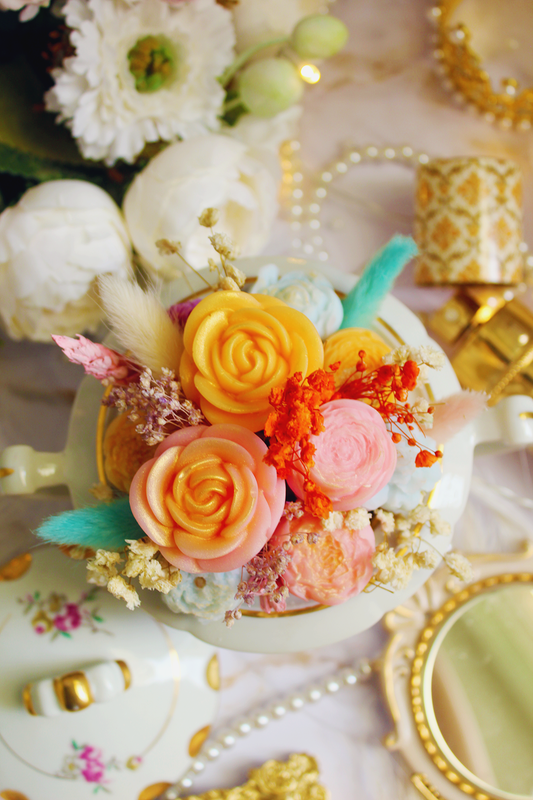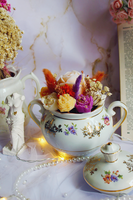 Une idée super m'est venue à l'esprit : que diriez-vous de redonner vie à ces magnifiques théières anciennes ? Il en existe de nombreuses dans les brocantes, souvent laissées à l'abandon. Ces pièces uniques apportent une touche décorative irrésistible à votre intérieur, tout en diffusant un parfum agréable grâce à leurs fleurs en cire d'olive hautement parfumé. Le meilleur dans tout cela ? Vous pouvez conserver leur bouquet éternellement, sans entretien necessaire !