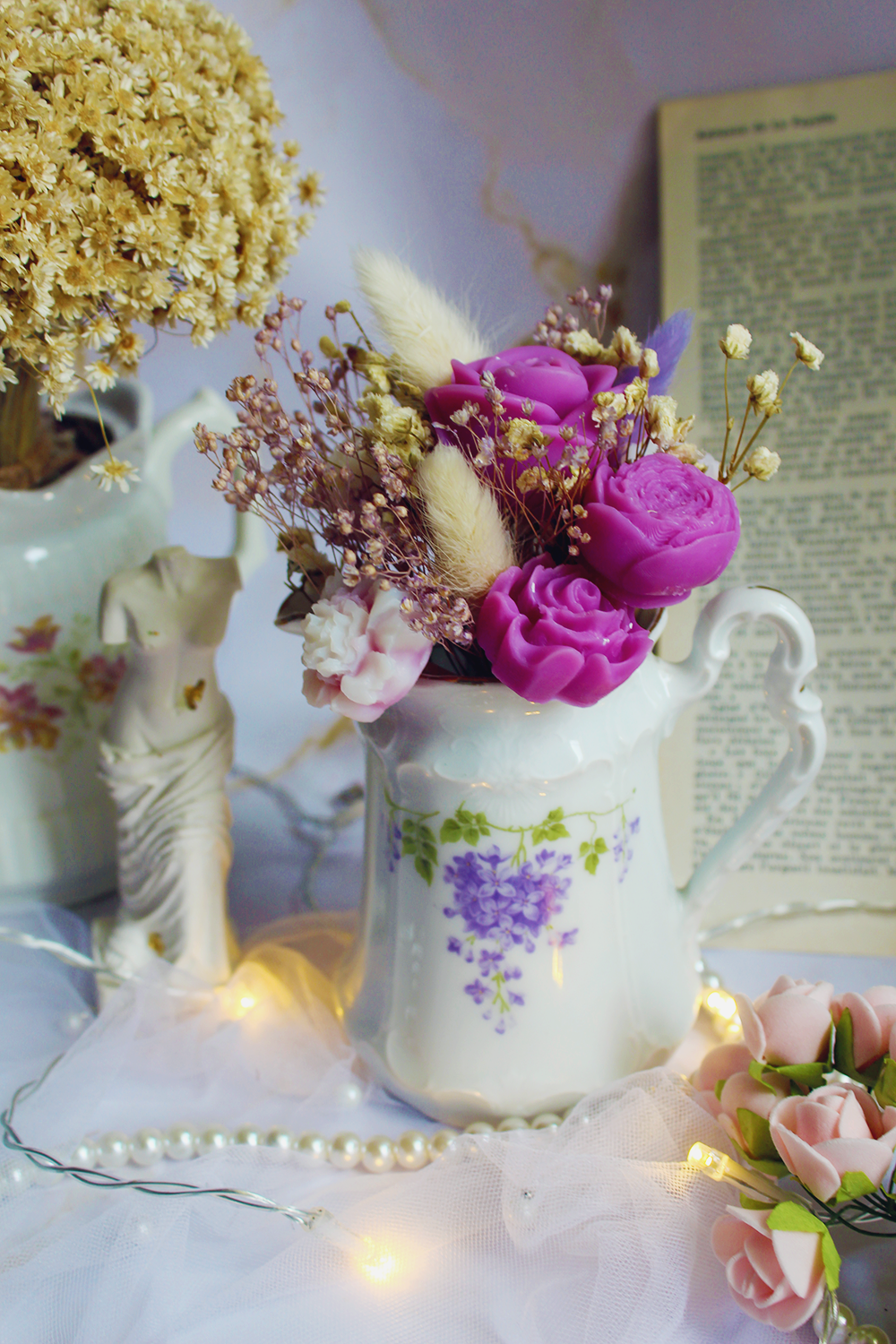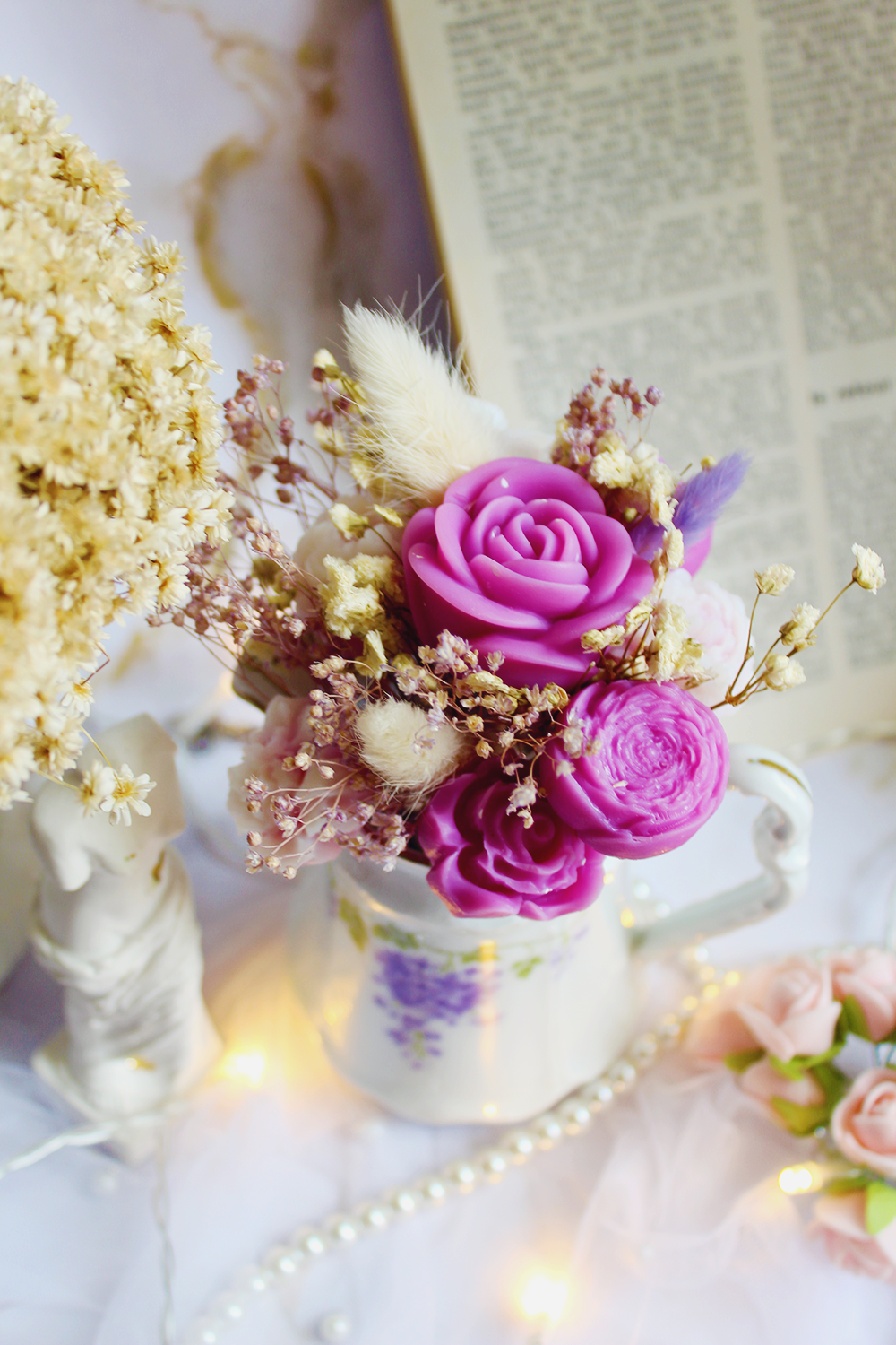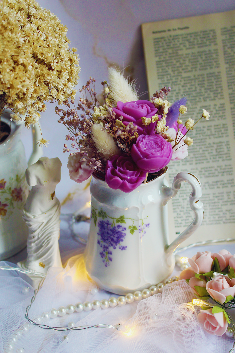 Offrez un voyage sensoriel et visuel avec ce bouquet de fleurs en cire parfumées, présenté dans un authentique pot à lait en porcelaine fleurie au charme vintage. Un mariage envoûtant entre fleurs séchées naturelles et fondants en cire d’olive qui abritent un parfum exotique "Paradis Tropical" aux notes fruitées et solaires. Les notes de tête de litchi, de mandarine et de cerise s'harmonisent avec un cœur de freesia, de pomme et de rose, le tout reposant sur une base de cashmeran, de musc et d’ambre. Une composition qui mêle art, parfum et décoration.