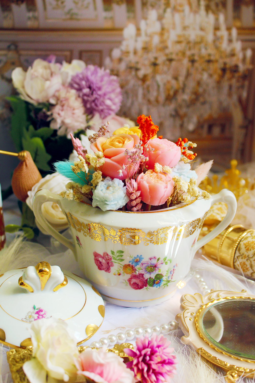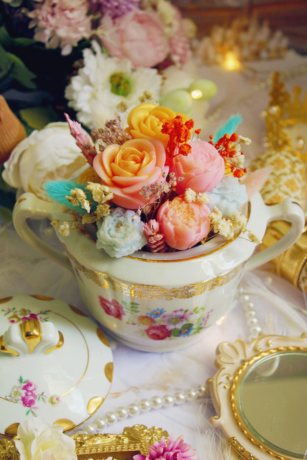 Laissez-vous séduire par l’élégance intemporelle de ce bouquet de fleurs en cire d’olive, entièrement façonné à la main et délicatement parfumé au champagne. Présenté dans une somptueuse bonbonnière florale vintage, ce bouquet est bien plus qu’un objet décoratif : c’est une œuvre d’art olfactive.