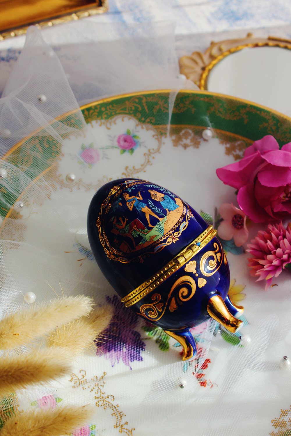 Plongez dans l’élégance et la poésie avec cet œuf en porcelaine bleu roi, véritable bijou d’exception. Orné d’un décor grec finement doré, inspiré des mythes antiques, il incarne le raffinement intemporel et l’art du détail.