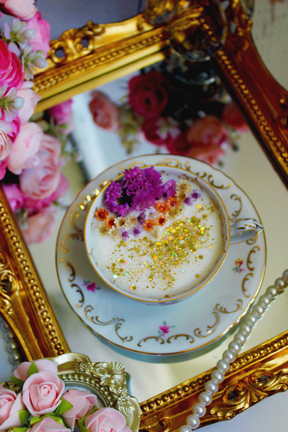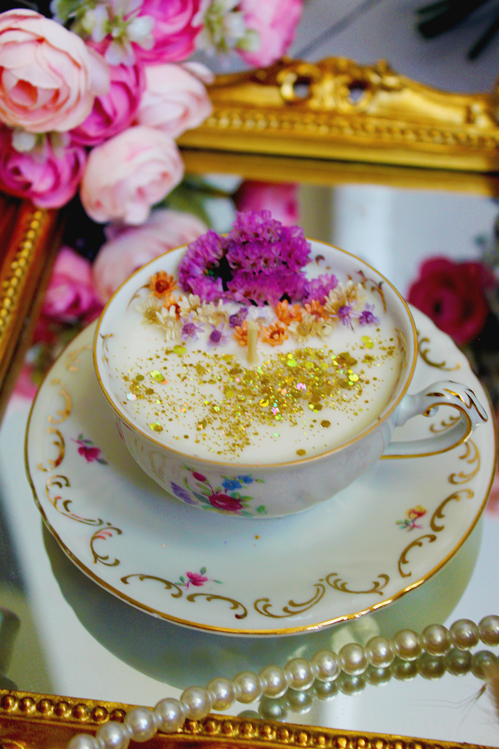 Cette bougie, lovée dans une porcelaine de Bavière fleurie aux reflets dorés, est un petit trésor où le temps semble suspendu. La cire blanche s’orne de pétales séchés et de paillettes d’or, comme un jardin miniature qui s’illumine à la lueur du feu.Allumer cette bougie, c’est inviter la douceur, la poésie et l’élégance d’antan dans votre intérieur avec son parfum de paradis tropical,les notes de tête de litchi, de mandarine et de cerise s'harmonisent avec un cœur de freesia, de pomme et de rose, le tout reposant sur une base de cashmeran, de musc et d’ambre.Une lumière délicate, un parfum subtil, et l’impression de savourer un moment hors du temps, comme une tasse de thé parfumé. Une flamme pour réchauffer, un éclat pour émerveiller, un objet unique pour raconter une histoire.Chaque pièce est unique, mêlant élégance intemporelle et douceur artisanale. Une fois la bougie consumée, la tasse pourra être réutilisée en objet déco ou pour vos thés précieux.